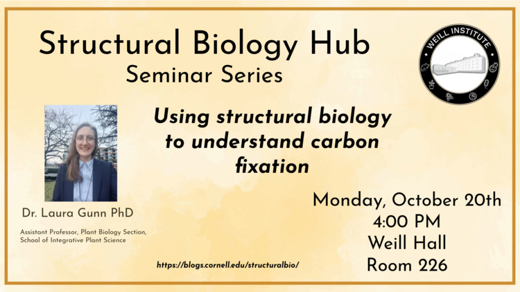 Join Weill Institute for Cell and Molecular Biology and the Structural Biology Hub on Monday October 20, 2025 for the first in our seminar series featuring Associate Professor, Dr. Laura Gunn, Ph.D. from the Plant Biology Section in the School of Integrative Plant Sciences as she delves into Using structural biology to understand carbon fixation.   MONDAY OCTOBER 20, 2025 4:00 PM 226 WEILL HALL    Structural Biology is undergoing a transformation. Breakthrough technologies, from AI-driven structure prediction like AlphaFold to cutting-edge cryo-EM and next-generation mass spectrometry, are rapidly changing how we study protein structure, interactions, and function. The Structural Biology Hub will bring together leading technologists and expert users...